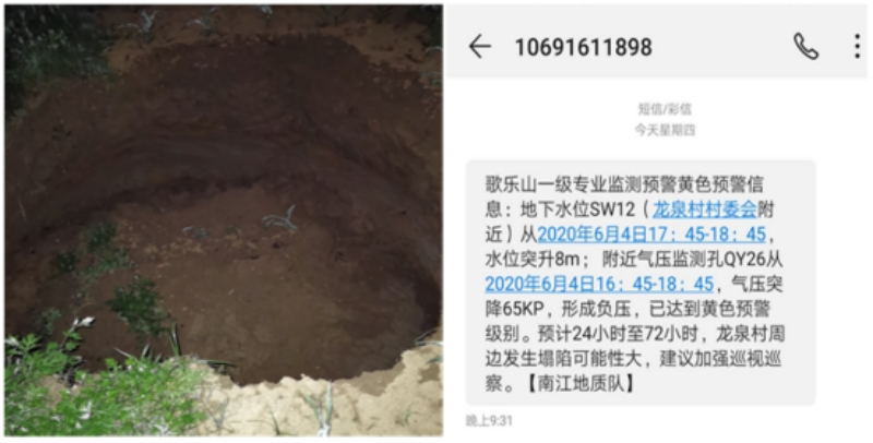 2020年6月4日21時30分,重慶市大型地質(zhì)災(zāi)害一級專業(yè)監(jiān)測項目——歌樂山巖溶地面塌陷智能化預(yù)警平臺成功預(yù)警了兩處巖溶地面塌陷。本次及時預(yù)警,未造成人員傷亡,這在重慶尚屬首例。