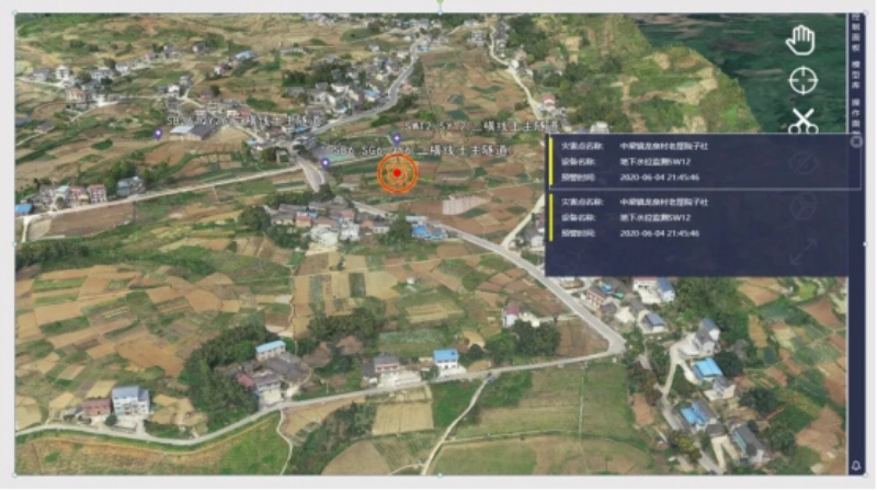 2020年6月4日晚18點45分,歌樂山一級監(jiān)測項目12號監(jiān)測點(位于龍泉村村委會附近)的水位、水壓、氣壓三個監(jiān)測傳感器均超過設(shè)定的預(yù)警閾值,系統(tǒng)實時捕捉到異常情況并立即觸發(fā)平臺告警: